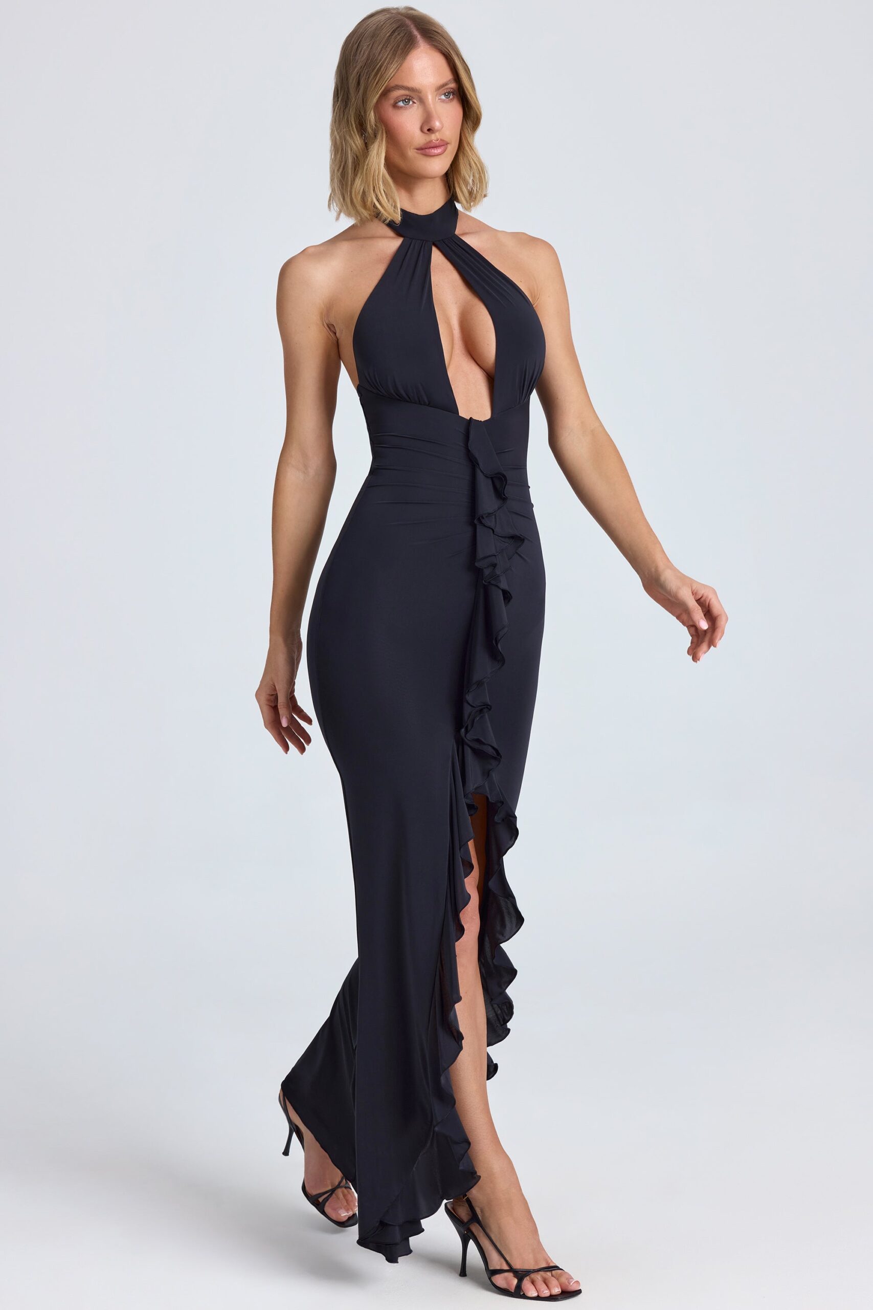 An ode to an endless summer. A perfect addition to your holiday and occasion wardrobe. the Apolline dress is crafted from lightweight sheer jersey with a full lining for enhanced coverage and comfort. It’s cut to a statement fishtail silhouette with figure-enhancing ruching at the waist and cascading ruffle trims at the front that highlight the thigh-high split. The halter neckline is punctuated with a striking cut-out.