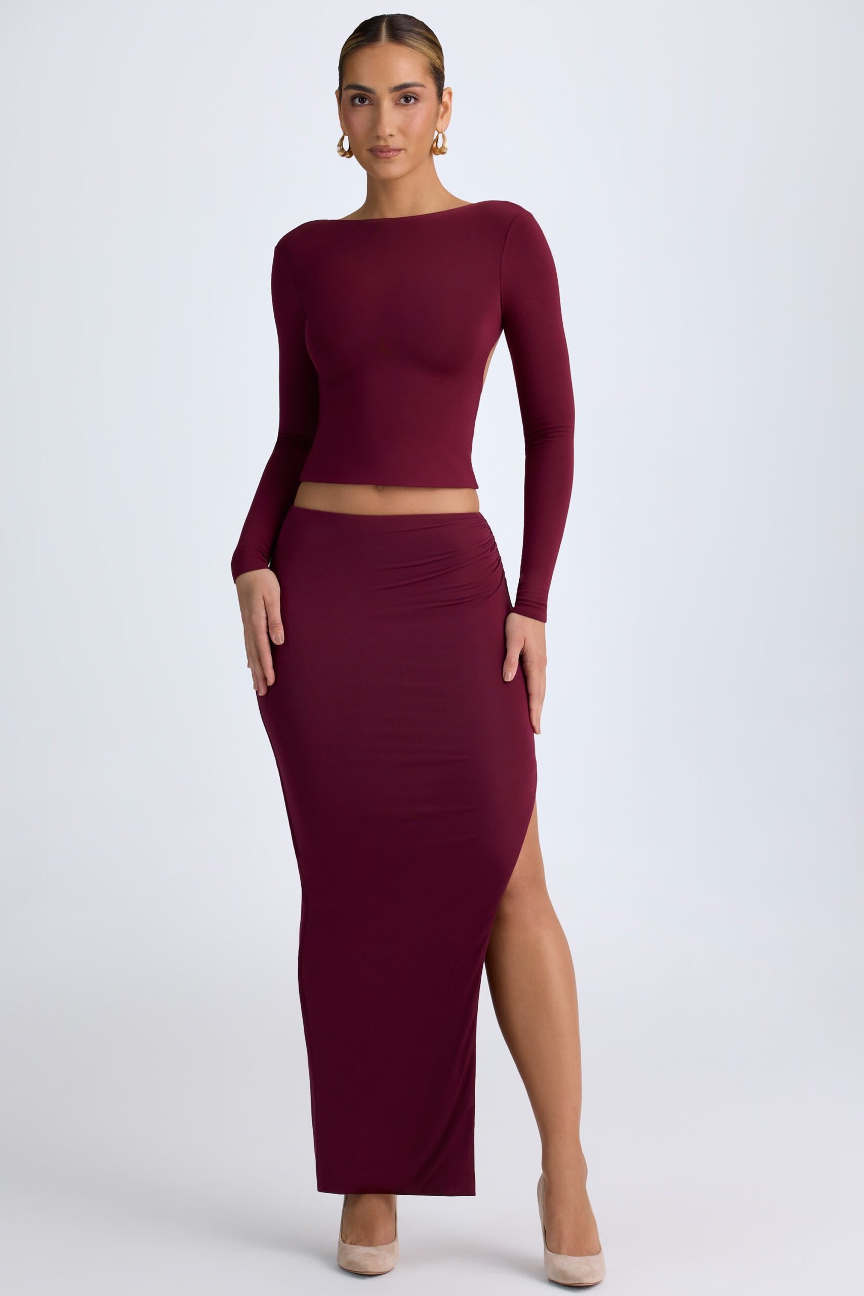 Timeless silhouettes. Rendered in two classic hues for versatile year-round styling. the Carolina maxi skirt is crafted from buttery soft. breathable and stretchy jersey made with TENCELâ„¢ Modal fibres derived from controlled or certified wood sources. Designed for a low-rise fit. it’s anchored with flattering ruching at the side for a sculpted look and finished with a thigh-high split.