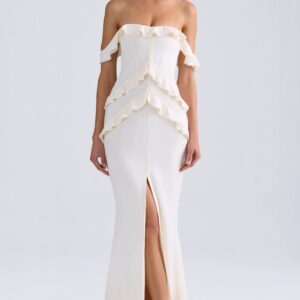 Effortlessly elegant. the Aurelie was designed for romantic events. It’s cut from premium stretch georgette to a column silhouette with a bust-flattering V-neckline anchored by delicate straps. Statement ruffle detailing completes the maxi skirt that’s enhanced with a sultry thigh-high split.