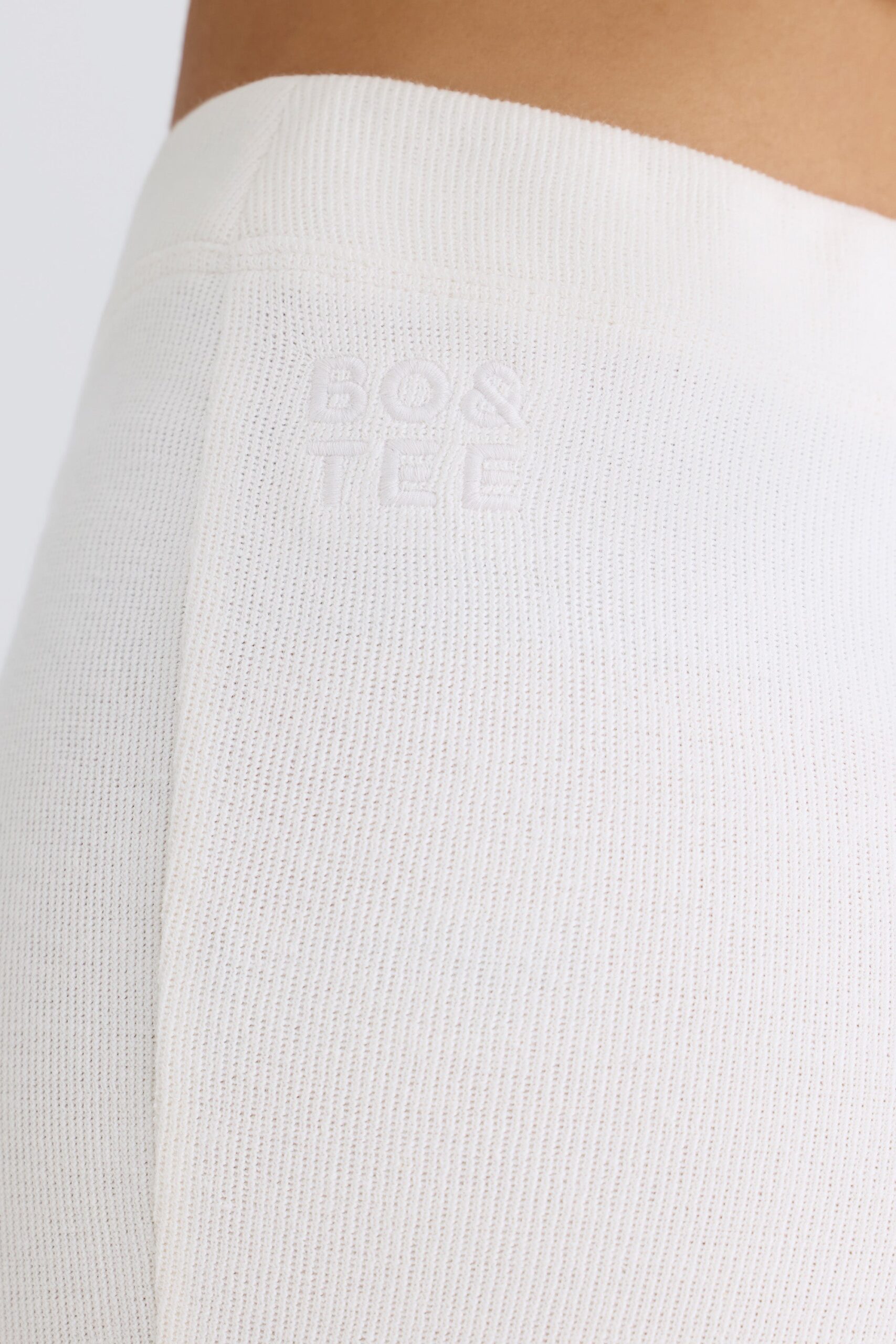 Summer staples. Perfect for styling at home or on holiday. these trousers are rendered in two classic neutral hues. They’re crafted from lightweight. textured cotton jersey with a touch of stretch and cut to a universally flattering flared silhouette. The V-shaped elasticated waistband creates a contoured look and the design is finished with a tonal embroidered Bo&Tee logo at the back.