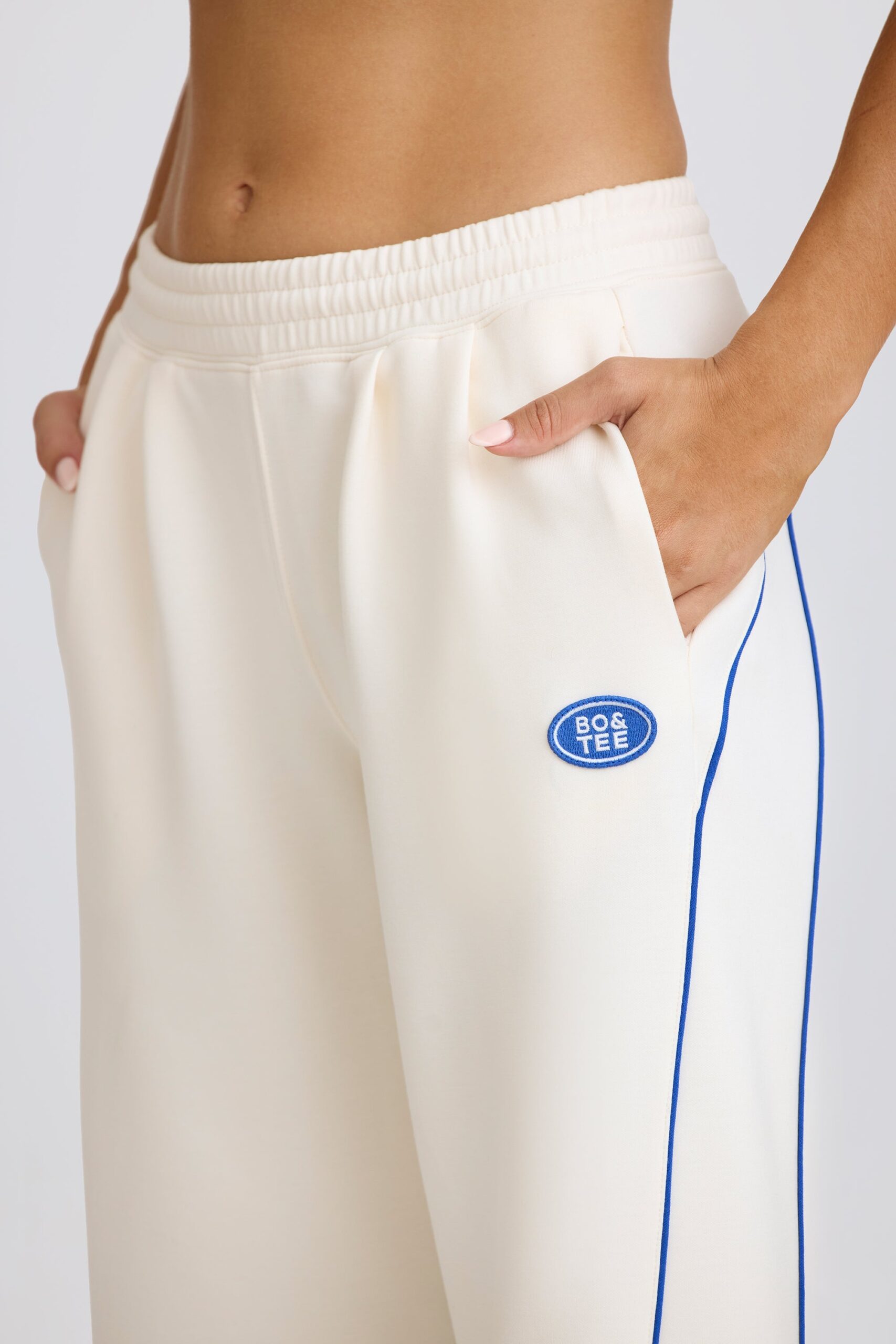 Style aces. An off-court staple. these joggers are crafted from soft and slouchy scuba jersey to a relaxed straight-leg silhouette. Universally flattering and designed for a mid-rise fit. they’re set on an elasticated waistband and feature perfectly placed front pleats. They’re complete with a signature Bo&Tee badge logo and contrast piping seams. inspired by the clean lines of sports courts.
