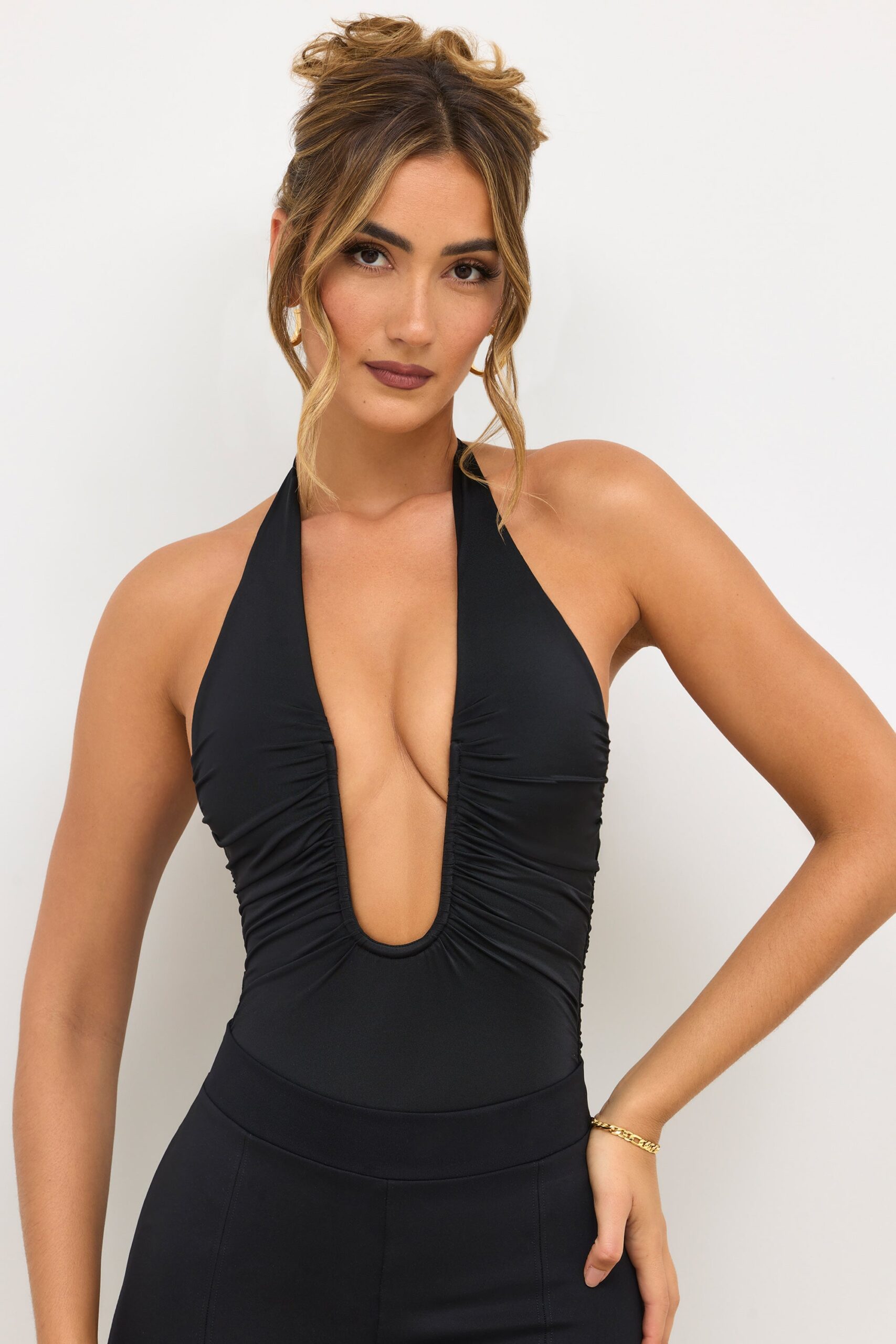 A versatile one-piece cut from our super-soft and stretchy premium jersey. the Agata extreme plunge bodysuit is designed to be worn with jeans and maxi skirts. Agata features ruching throughout. wiring at the bust for extra support and clasp fastening at the nape of the neck.