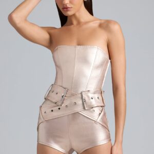 Metallic Denim Belted Corset Playsuit in Champagne