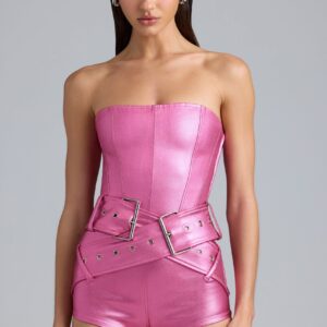 Metallic Denim Belted Corset Playsuit in Deep Pink