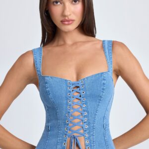 Lace-Up Corset Top in Mid Blue Stonewash